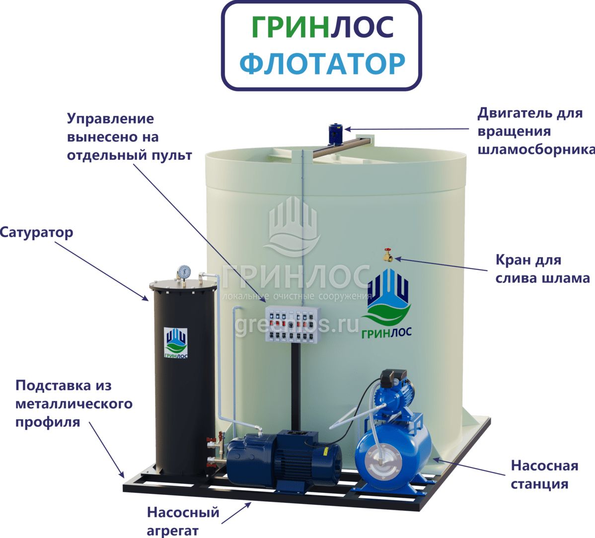Промышленный ГРИНЛОС Флотатор 6 представляет собой современную конструкцию, которая позволяет добиться высокой степени очистки сточной воды.