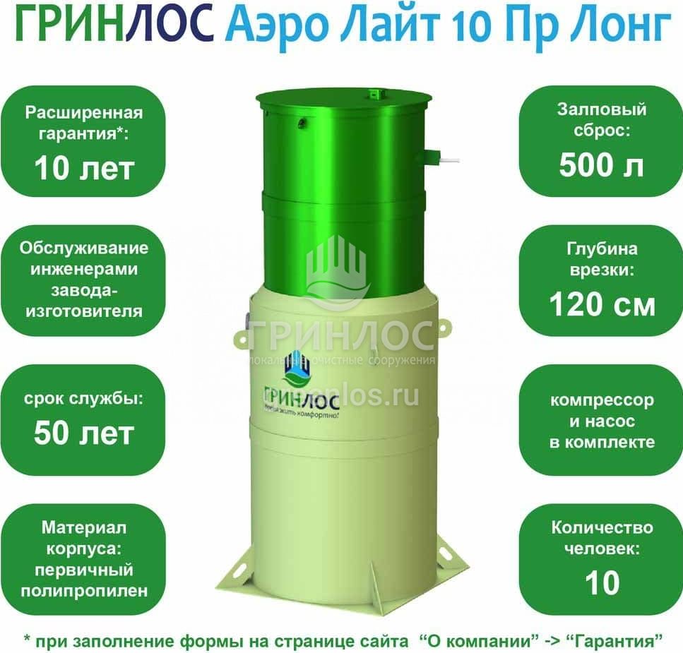 Отличительными особенностями септика Гринлос Аэро Лайт 10 ПР Лонг являются: