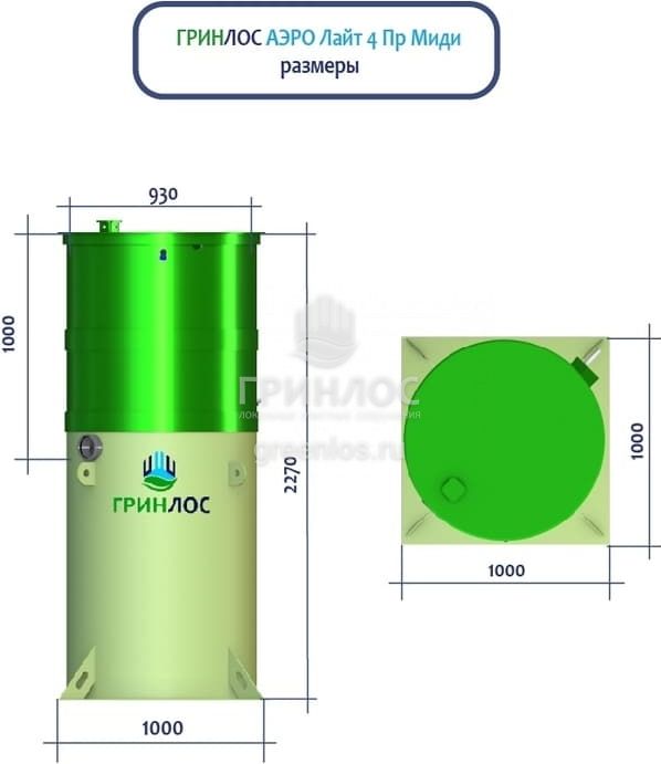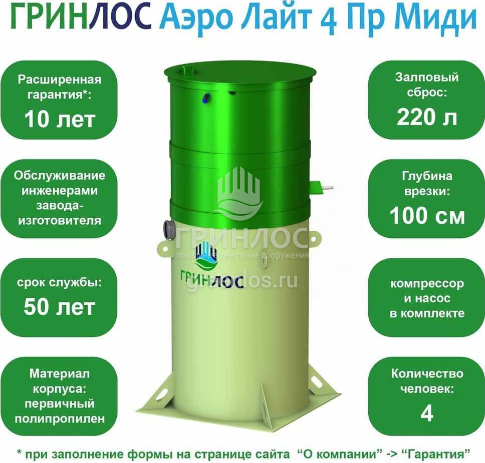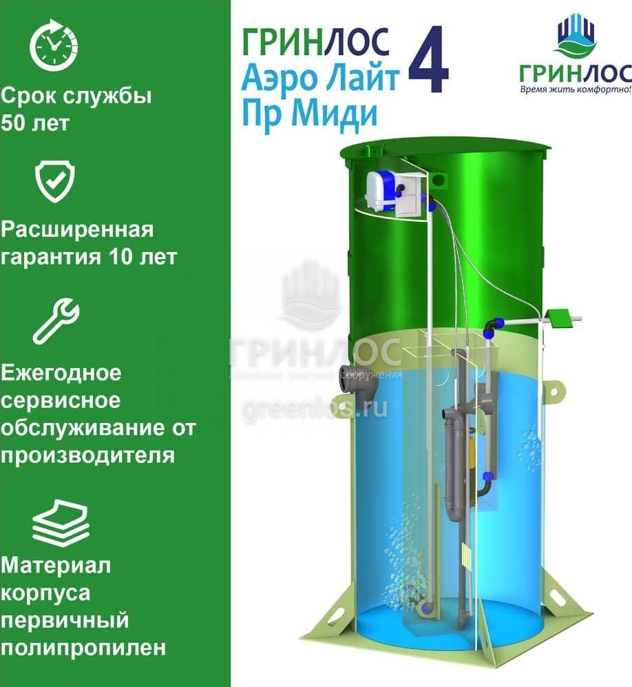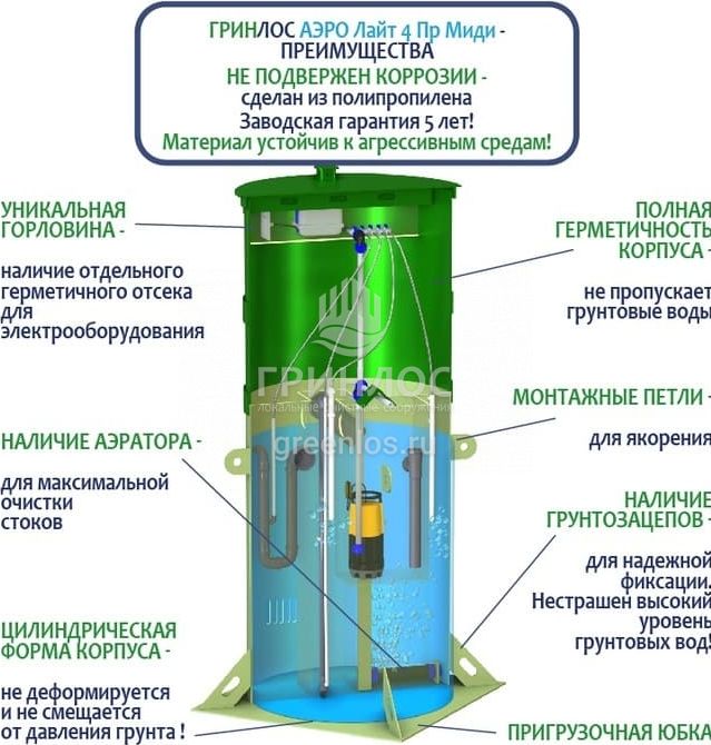 Отличительными особенностями септика Гринлос Аэро Лайт 4 Пр Миди являются: