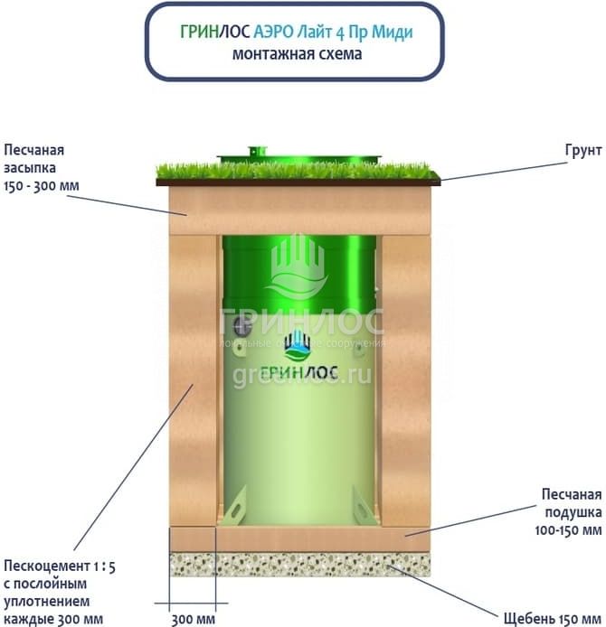 Поверх корпуса Гринлос Аэро Лайт 4 Пр Миди выполняется песчаная обсыпка на высоту 150-300 мм. Для подсоединения оборудования к внутренней канализационной магистрали применяют канализационные трубы, предназначенные для эксплуатации.
