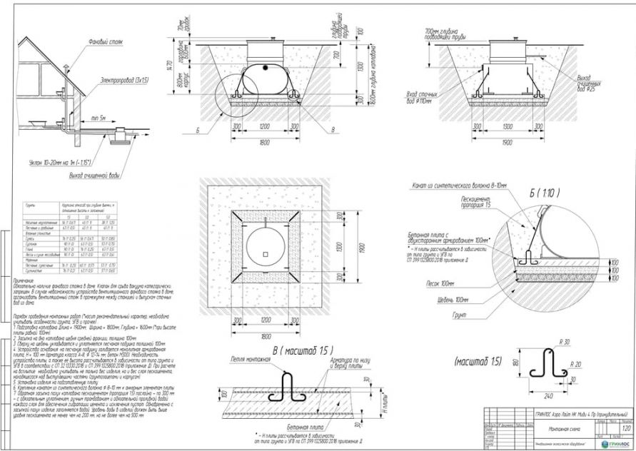 Дно котлована требует более тщательной подготовки: его необходимо выровнять и засыпать слоем песка толщиной 30 см. Кроме того, углубления котлована необходимо засыпать песком, увлажнять послойно. Перед проведением этих работ станцию заполняют водой на одну четверть её объема, а затем уровень воды увеличивается пропорционально засыпке песком внешних стенок. Каждый слой песка толщиной в 200 мм должен дополнительно уплотняться вручную.