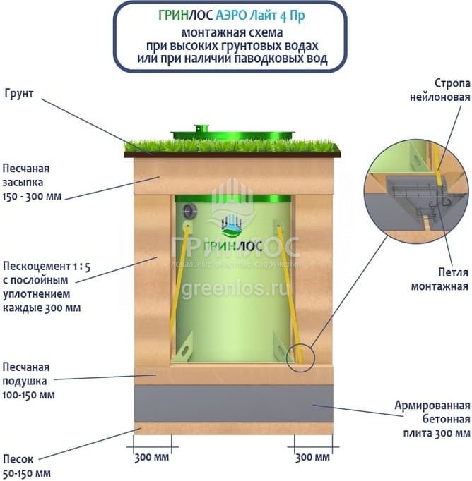 Перед непосредственным монтажом Гринлос Аэро Лайт 4 Пр специалисты осуществляют подготовку котлована. Его размеры определяются конструктивными особенностями выбранной модели оборудования. Ознакомиться с данными параметрами можно в приложении к ПС.