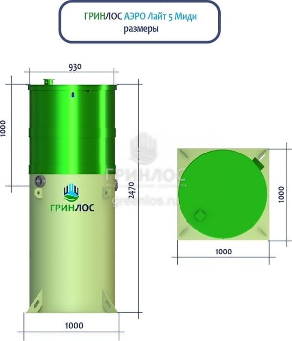 Высота корпуса Гринлос Аэро Лайт 5 Миди — 2.47 м, а врезка подводящей трубы осуществляется на глубине до 100 см. Станция подходит для монтажа во все виды почв: песок, глина, суглинок, грунты с высоким уровнем грунтовых вод.