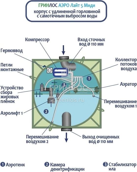 Отличительными особенностями септика Гринлос Аэро Лайт 5 Миди являются: