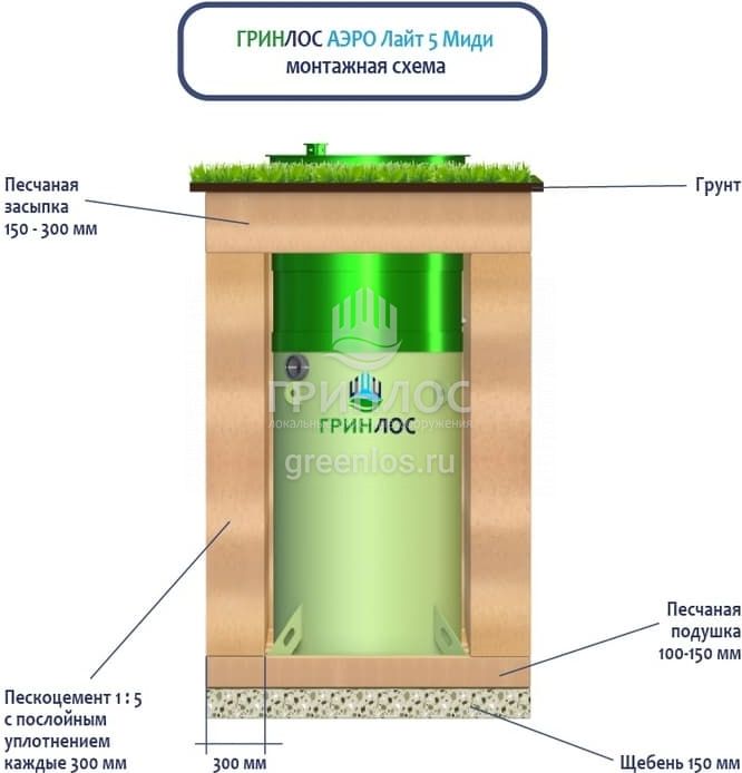Поверх корпуса Гринлос Аэро Лайт 5 Миди выполняется песчаная обсыпка на высоту 150-300 мм. Для подсоединения оборудования к внутренней канализационной магистрали применяют канализационные трубы, предназначенные для эксплуатации.