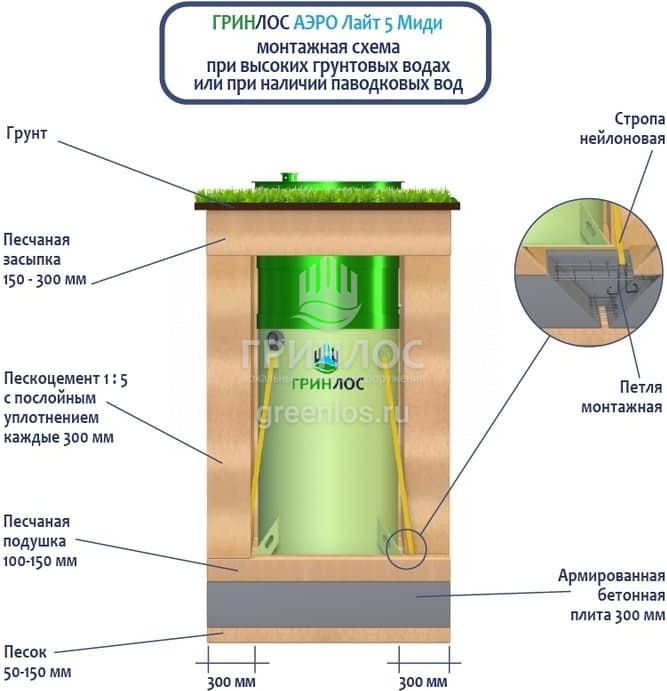 Станции очистки Гринлос Аэро Лайт 5 Миди обладают надежными грунтозацепами, действительно предотвращающими всплытие оборудования на обводненных участках.