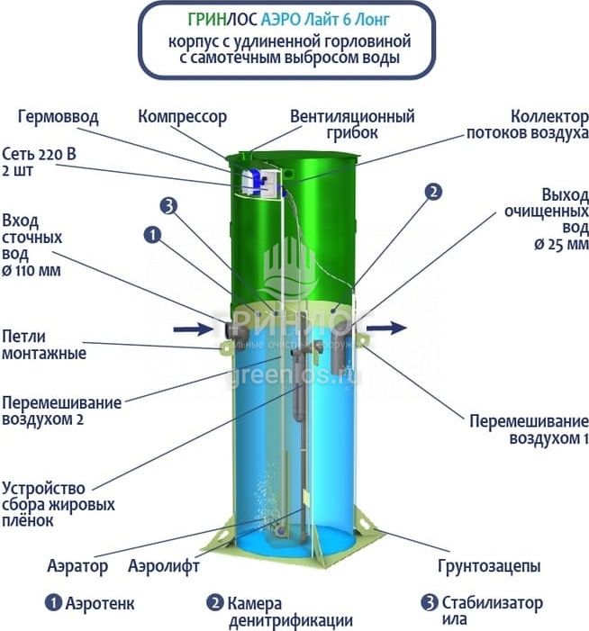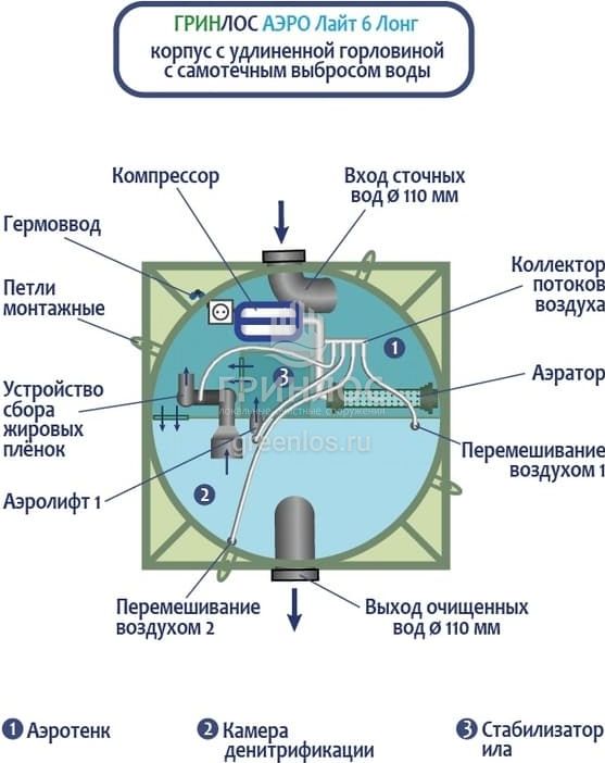 Станция Гринлос Аэро Лайт 6 Лонг сконструирована таким образом, что все камеры, в которых происходит аэрация, разделение и осветление стоков объединены в одном корпусе цилиндрической формы.