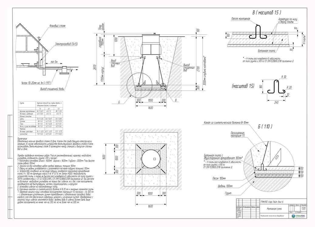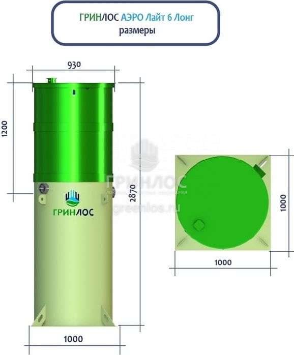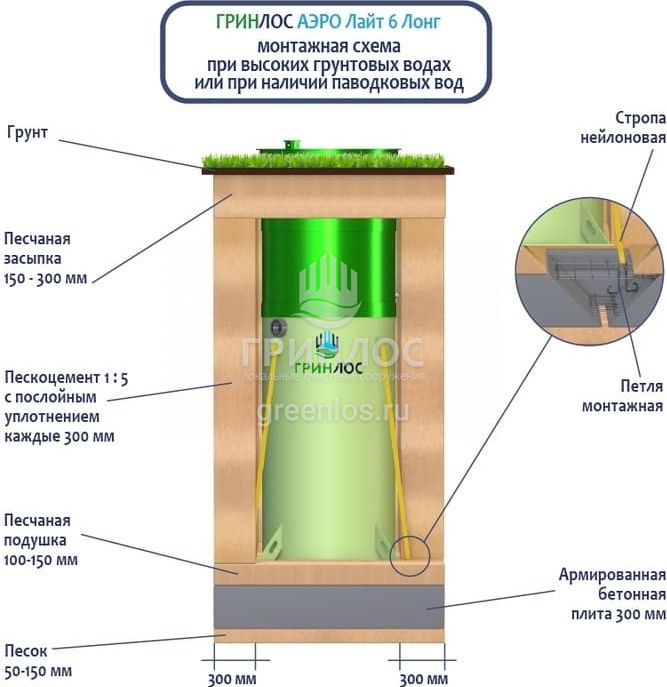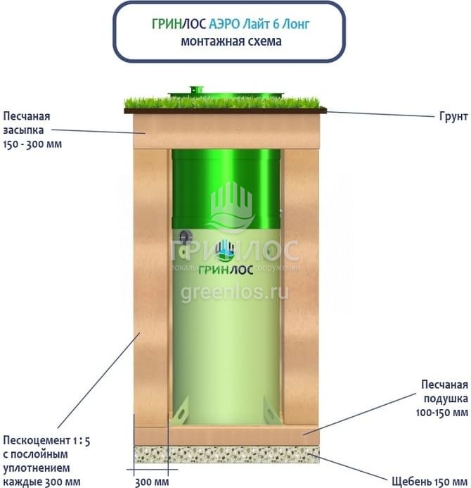 Высота корпуса Гринлос Аэро Лайт 6 Лонг — 2.87 м, а врезка подводящей трубы осуществляется на глубине до 120 см. Станция подходит для монтажа во все виды почв: песок, глина, суглинок, грунты с высоким уровнем грунтовых вод.