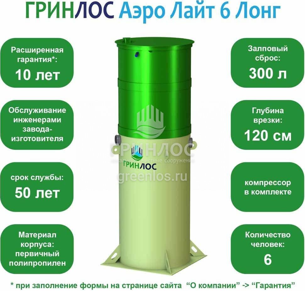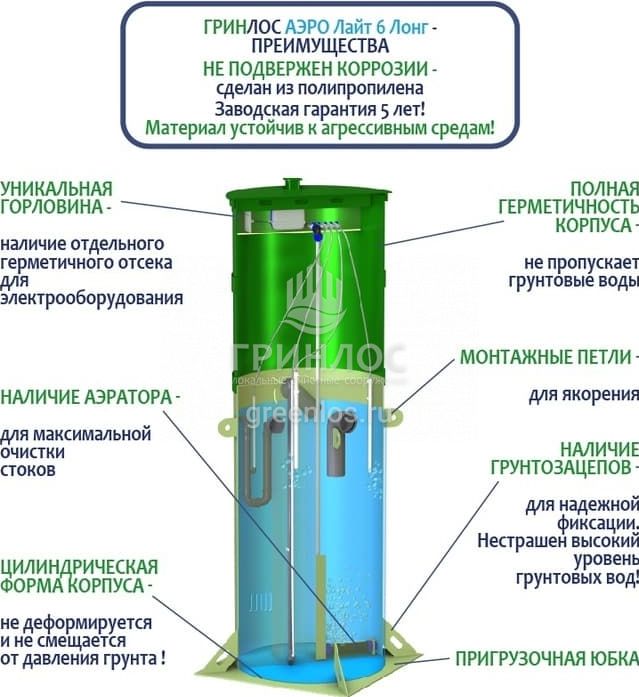Отличительными особенностями септика Гринлос Аэро Лайт 6 Лонг являются: