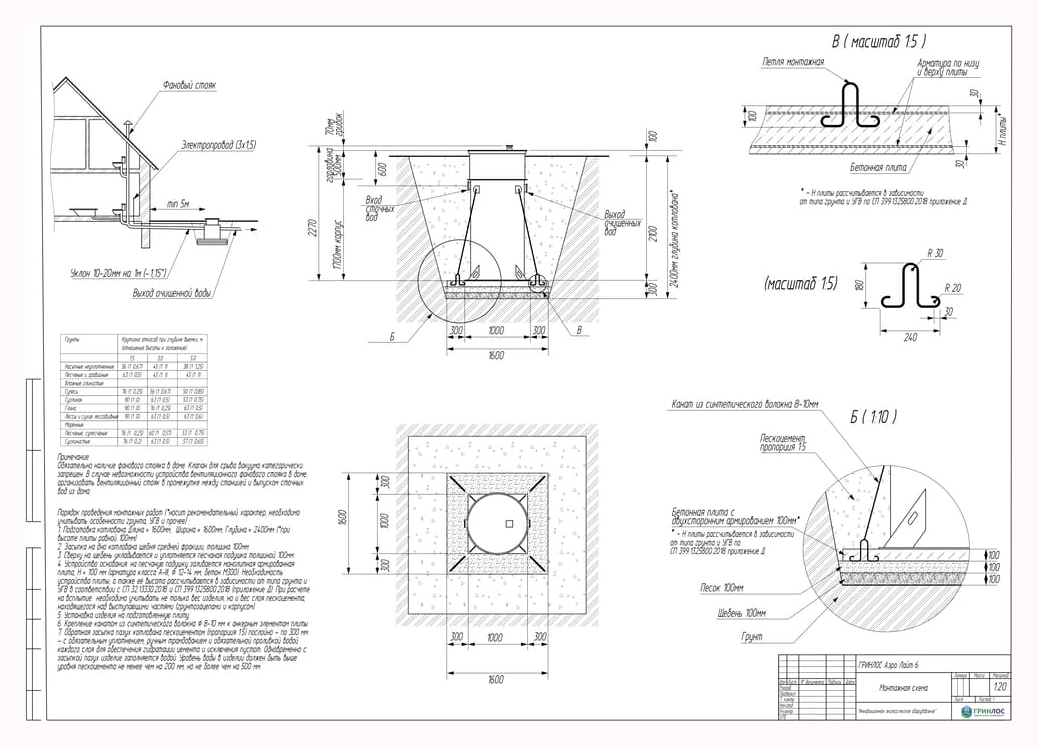 Высота корпуса Гринлос Аэро Лайт 6 — 2.27 м, а врезка подводящей трубы осуществляется на глубине до 60 см. Станция подходит для монтажа во все виды почв: песок, глина, суглинок, грунты с высоким уровнем грунтовых вод.
