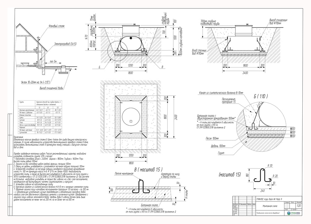 Перед непосредственным монтажом Гринлос Аэро Лайт НК специалисты осуществляют подготовку котлована. Его размеры определяются конструктивными особенностями выбранной модели оборудования. Ознакомиться с данными параметрами можно в приложении к ПС.