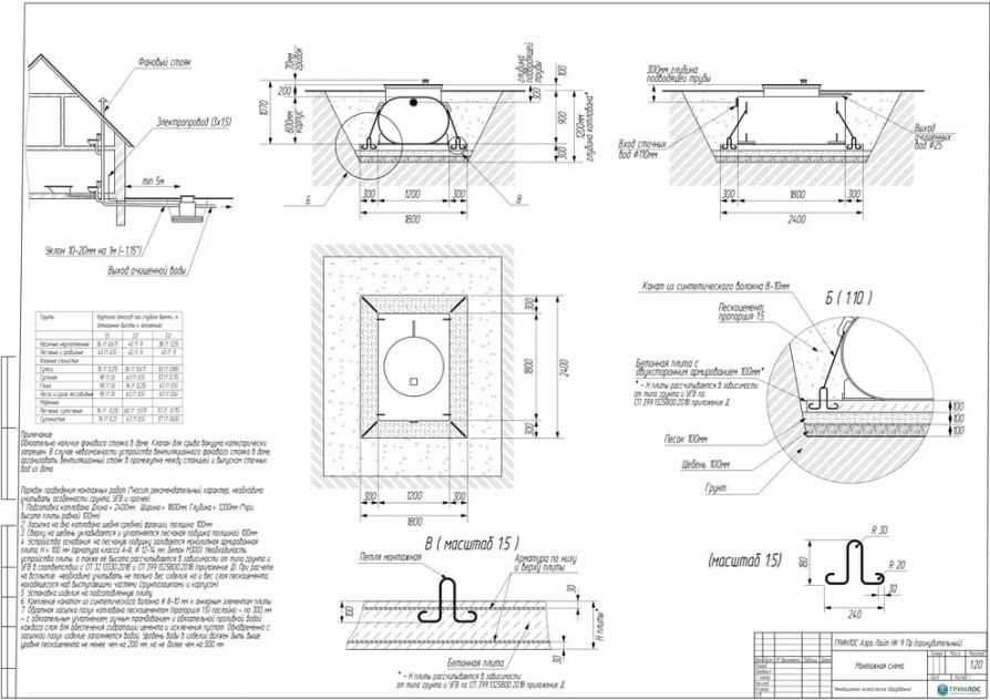 Дно котлована требует более тщательной подготовки: его необходимо выровнять и засыпать слоем песка толщиной 30 см. Кроме того, углубления котлована необходимо засыпать песком, увлажнять послойно. Перед проведением этих работ станцию заполняют водой на одну четверть её объема, а затем уровень воды увеличивается пропорционально засыпке песком внешних стенок. Каждый слой песка толщиной в 200 мм должен дополнительно уплотняться вручную.