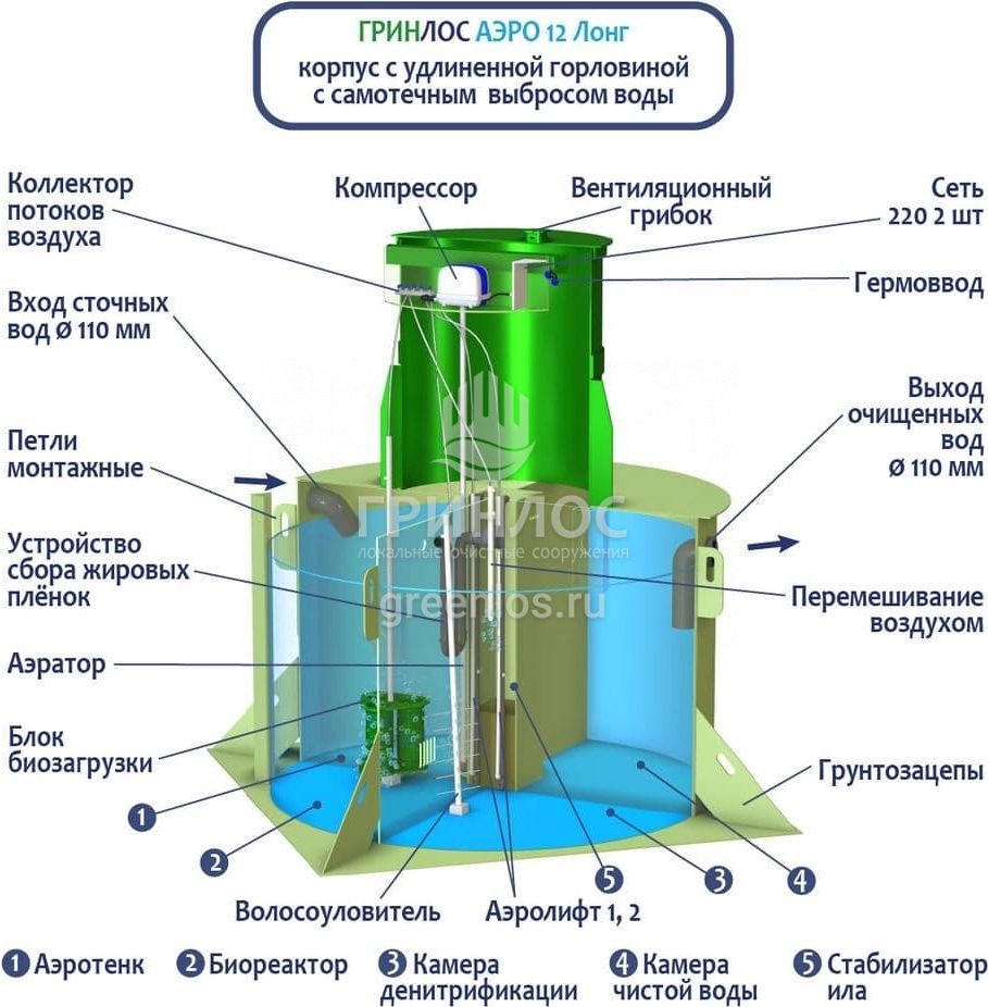 Станция ГРИНЛОС Аэро 12 Лонг сконструирована таким образом, что все камеры, в которых происходит аэрация, разделение и осветление стоков объединены в одном корпусе цилиндрической или овальной формы.