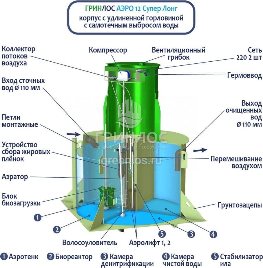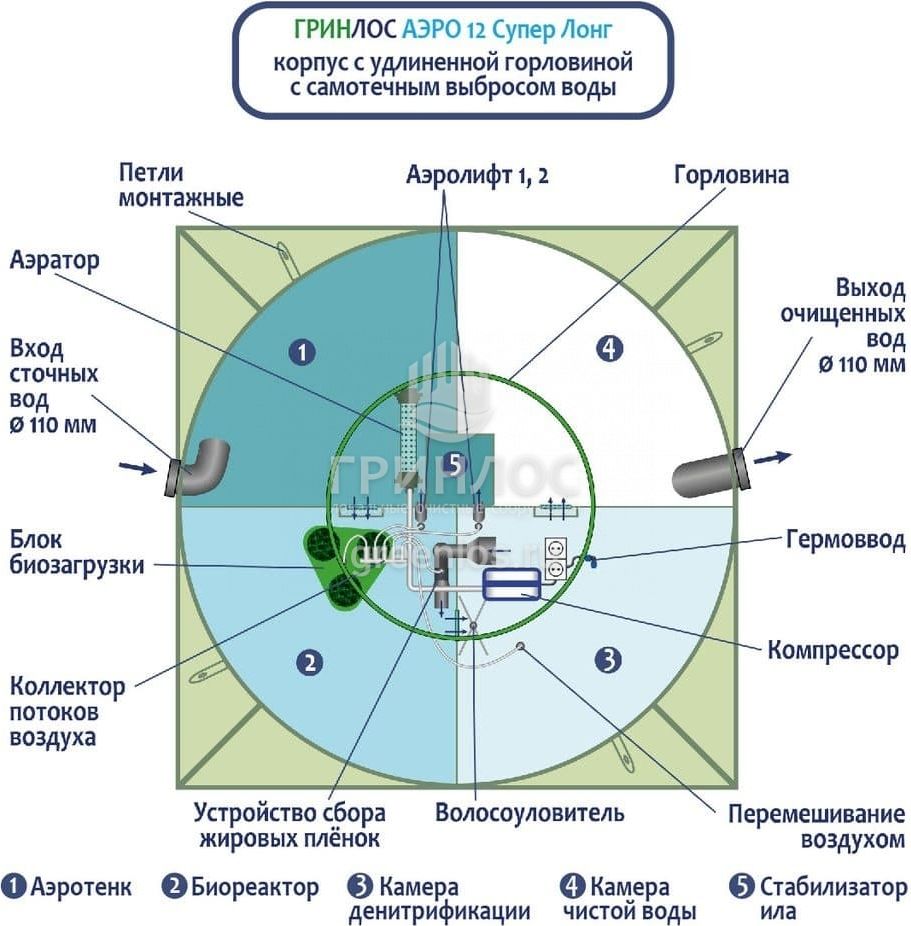 Станция ГРИНЛОС Аэро 12 Супер Лонг сконструирована таким образом, что все камеры, в которых происходит аэрация, разделение и осветление стоков объединены в одном корпусе цилиндрической или овальной формы.
