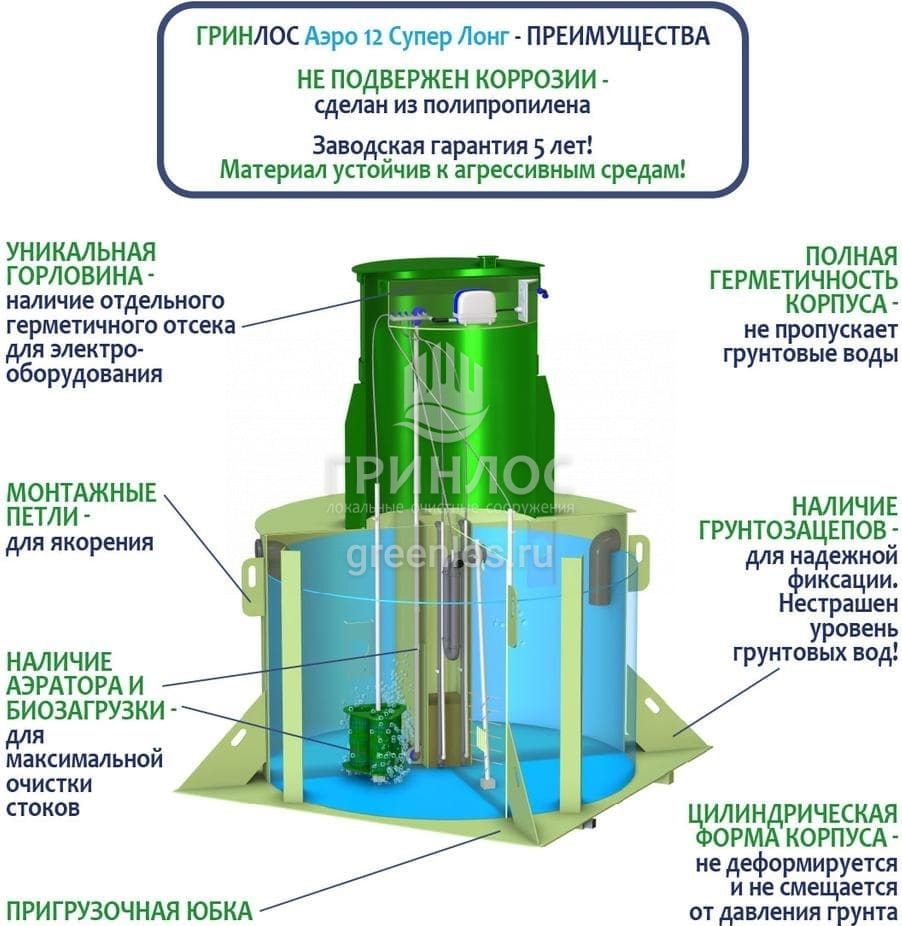 ГРИНЛОС Аэро 12 Супер Лонг – это станция биологической очистки сточных вод аэрационного типа. Максимальный залповый сброс в септик равен 980 л, а производительность станции равна 2.5 м3/сутки, что рассчитано на обслуживание 12 условных пользователей.