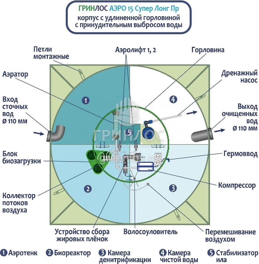 СБО ГРИНЛОС Аэро 15 Пр Супер Лонг изготавливаются из вспененного первичного полипропилена. Корпус разделен на пять отсеков со специальными технологическими переливами. Перетекая из одного отстойника в другой, стоки последовательно проходят процессы усреднения, аэрации, отстаивания, нитрификации и денитрификации и осветления.