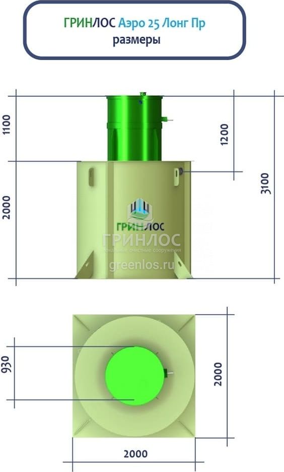 ГРИНЛОС Аэро 20 Пр Лонг – это станция биологической очистки сточных вод аэрационного типа. Максимальный залповый сброс в септик равен 1300 л, а производительность станции равна 3.5 м3/сутки, что рассчитано на обслуживание 20 условных пользователей.