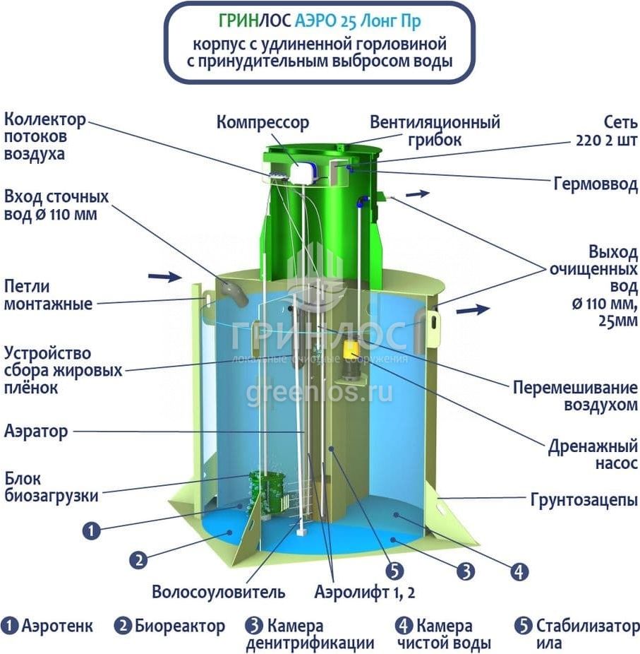 Станция ГРИНЛОС Аэро 20 Пр Лонг сконструирована таким образом, что все камеры, в которых происходит аэрация, разделение и осветление стоков объединены в одном корпусе цилиндрической или овальной формы.