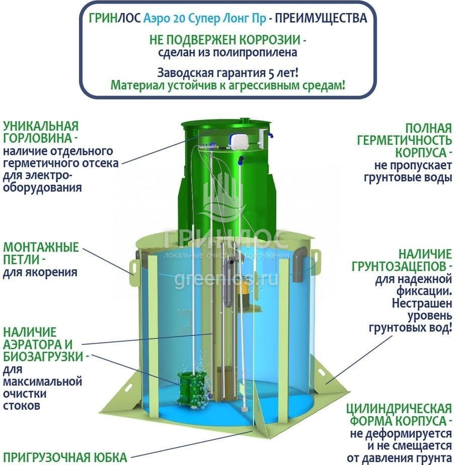 Естественный природный процесс в ГРИНЛОС Аэро 20 Пр Супер Лонг оптимизирован путем аэрации стоков и установки биофильтра (специального устройства, на котором образуется биопленка из микроорганизмов). Благодаря использованию двух видов ила – свободного и фиксированного, достигается более высокая степень очистки, удлиняется временной интервал планового обслуживания.