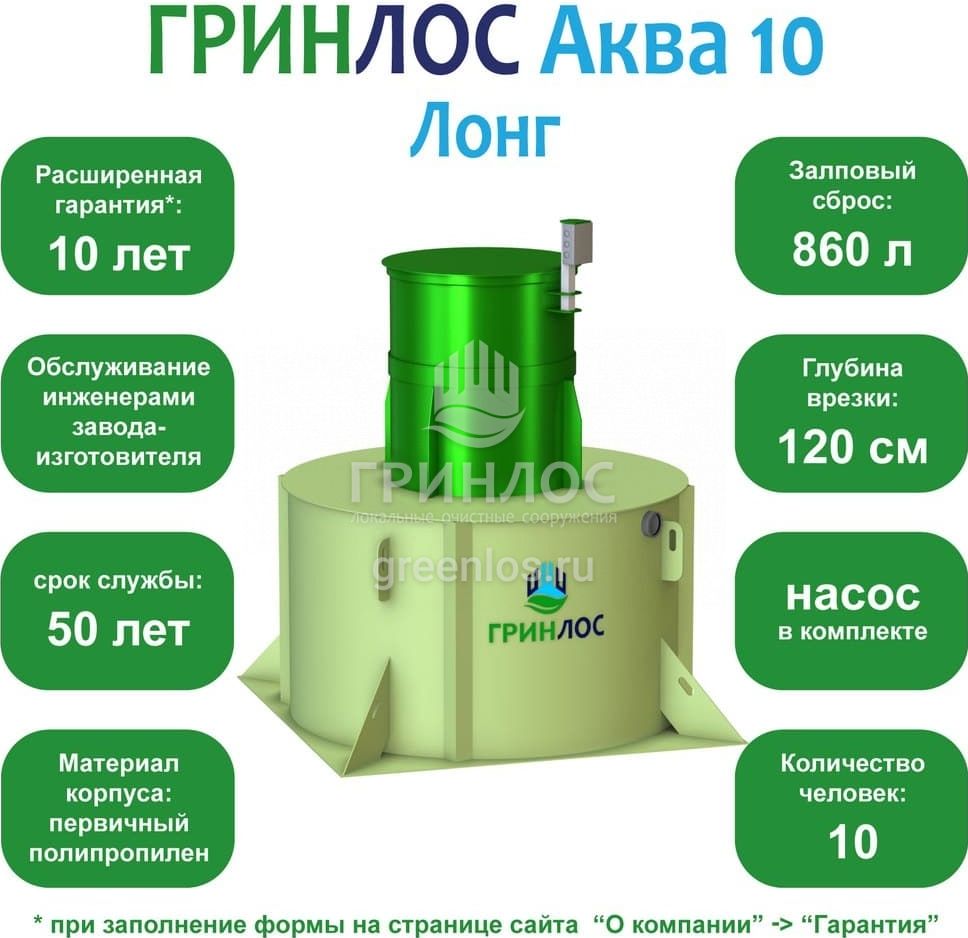 ГРИНЛОС Аква 10 Лонг – это бескомпрессорная станция переработки сточных вод. Конструкция данного септика позволяет принимать не более 860 л залпом, а производительность станции равна 2 м3/сутки. Септик подходит для комфортного проживания 10 человек.