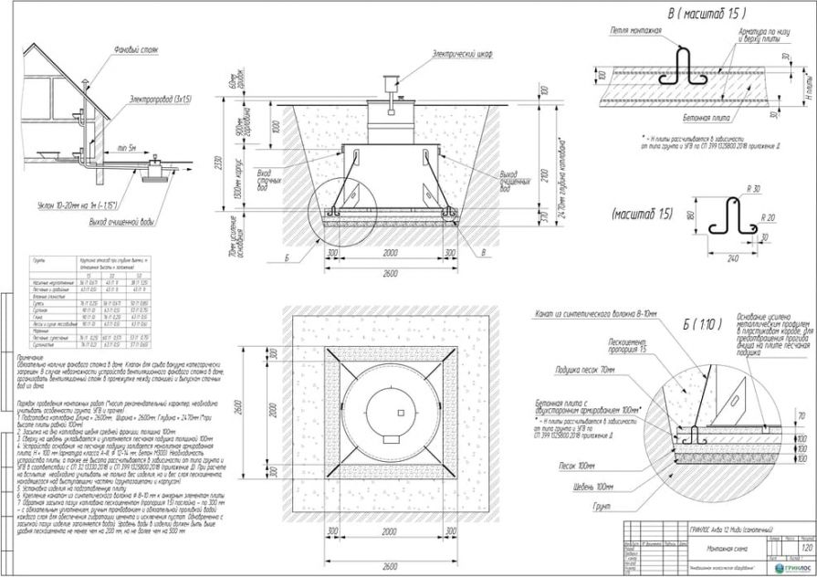 Целесообразно доверить выбор и монтаж оборудования специализированной компании. Перед непосредственным монтажом Оборудования специалисты осуществляют подготовку котлована. Его размеры определяются конструктивными особенностями выбранной модели оборудования. Ознакомиться с данными параметрами можно в приложении к ПС. По боковым стенкам корпуса должно быть сохранено свободное расстояние до грунта не менее 250 мм. Дно котлована нуждается в более тщательной подготовке. Его подвергают выравниванию с последующей засыпкой слоем песка, обладающим толщиной в пределах 10-15 см. Пазухи котлована подвергают обратной засыпке при помощи песка, который послойно поливают водой. Прежде чем приступить к аналогичным работам, емкость оборудования на четверть заполняют водой. Впоследствии количество воды внутри емкости увеличивают соразмерно уровню засыпки песком наружных стенок. Каждые 200 мм песка подвергаются ручному уплотнению.