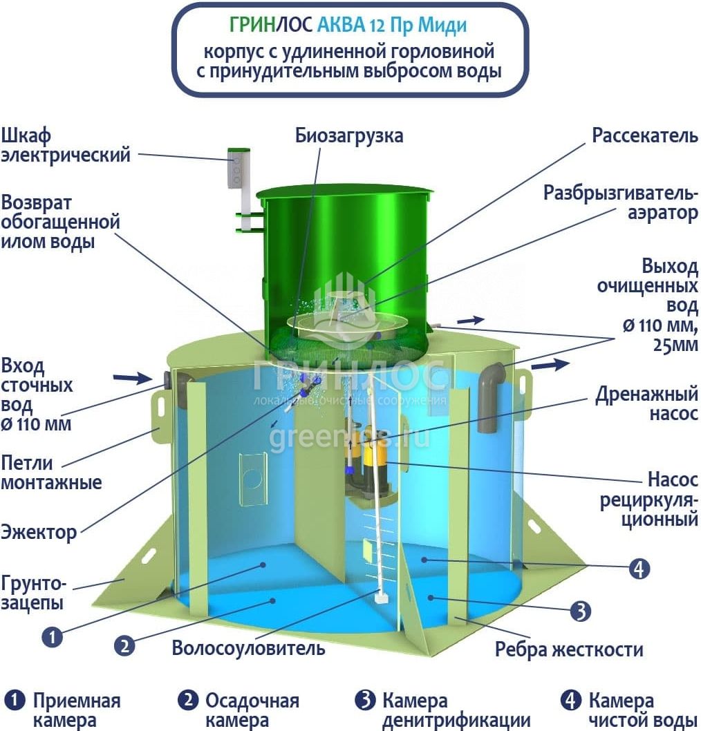 Станции очистки ГРИНЛОС Аква 12 Пр Миди предназначены для расщепления и переработки основных органических загрязнений, содержащихся в бытовых сточных водах. Попадая в септик и перемещаясь между камерами в корпусе, нечистоты последовательно проходят этапы усреднения, разделения и отстаивания, разделения на фракции (физическая переработка), а также взаимодействуют с бактериями из биозагрузки (биологическая переработка). Далее стоки усредняются и отстаиваются. Осветленная вода выводится наружу самотечным или принудительным образом.