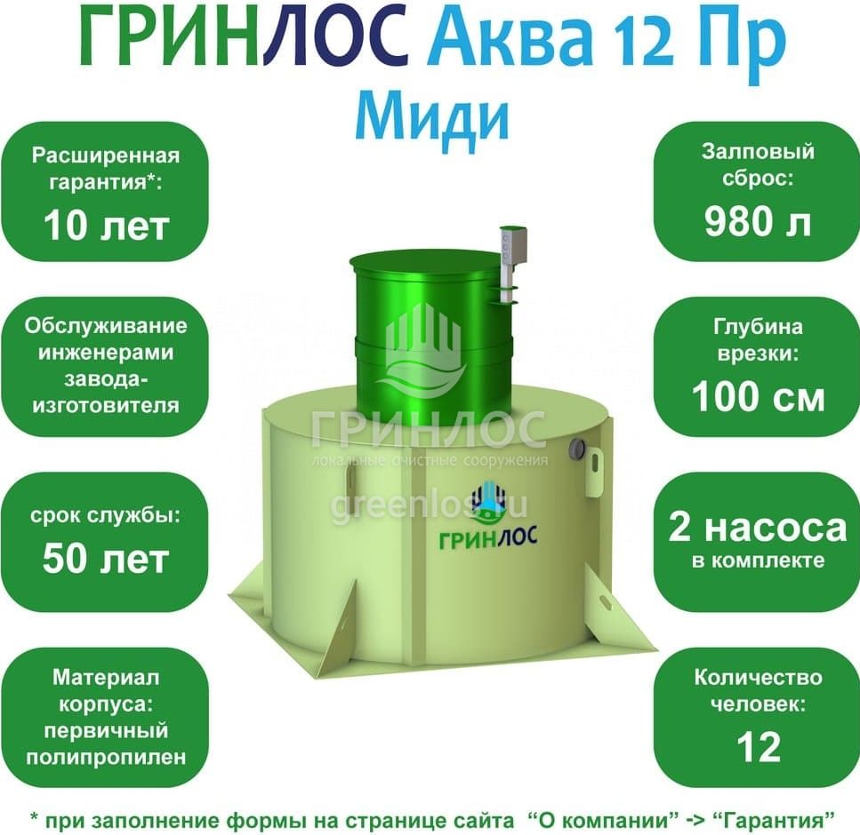 ГРИНЛОС Аква 12 Пр Миди – это бескомпрессорная станция переработки сточных вод. Конструкция данного септика позволяет принимать не более 980 л залпом, а производительность станции равна 2.5 м3/сутки. Септик подходит для комфортного проживания 12 человек.