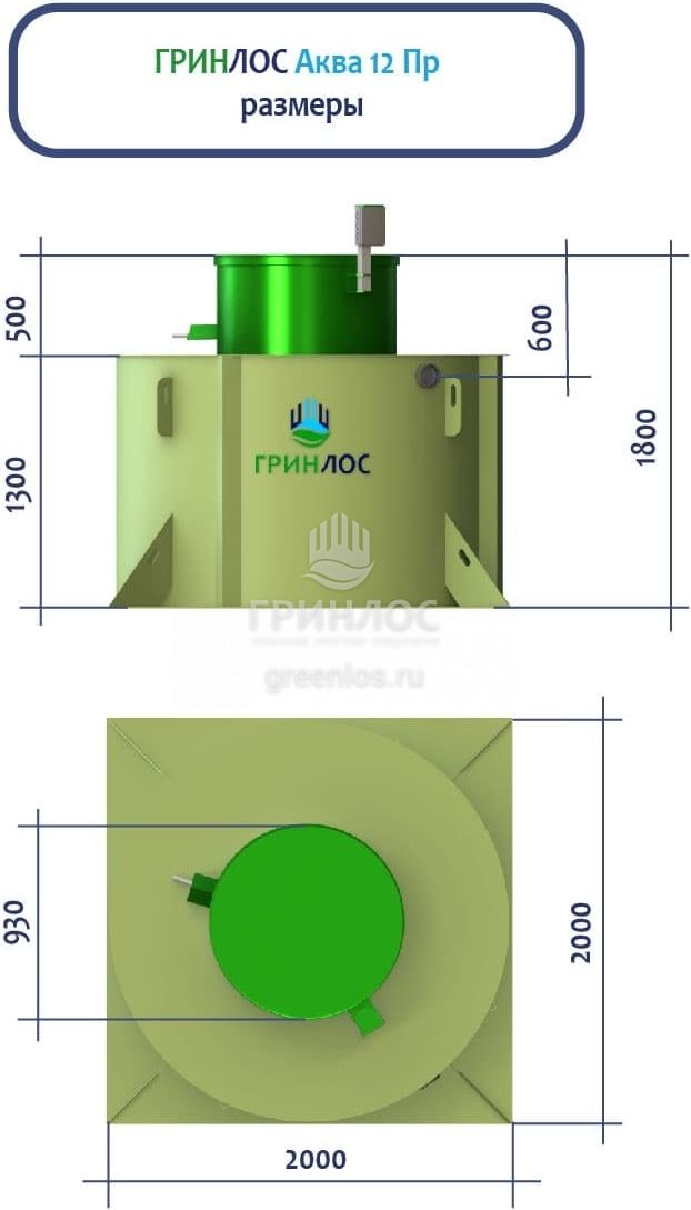 ГРИНЛОС Аква 12 Пр — это септик, который оснащен насосом. Обладает объемом залпового сброса 980 л и производительностью 2.5 м3/сутки, что делает его подходящим для домов, в которых число жильцов не превышает 12 условных пользователей. Оснащен фильтром грубой очистки и двумя насосами на полке.