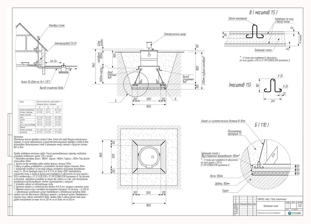 - Высота корпуса — 1900 мм. Станция подходит для монтажа во все виды почв: песок, глина, суглинок, грунты с высоким уровнем грунтовых вод.