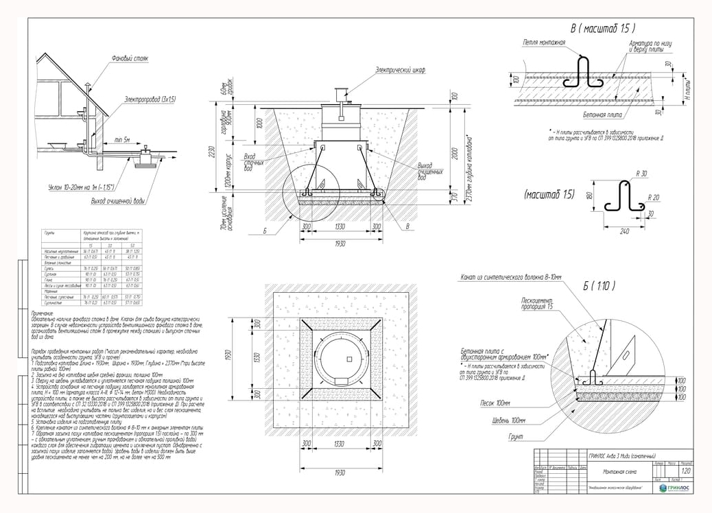 Целесообразно доверить выбор и монтаж оборудования специализированной компании. Перед непосредственным монтажом Оборудования специалисты осуществляют подготовку котлована. Его размеры определяются конструктивными особенностями выбранной модели оборудования. Ознакомиться с данными параметрами можно в приложении к ПС. По боковым стенкам корпуса должно быть сохранено свободное расстояние до грунта не менее 250 мм. Дно котлована нуждается в более тщательной подготовке. Его подвергают выравниванию с последующей засыпкой слоем песка, обладающим толщиной в пределах 10-15 см. Пазухи котлована подвергают обратной засыпке при помощи песка, который послойно поливают водой. Прежде чем приступить к аналогичным работам, емкость оборудования на четверть заполняют водой. Впоследствии количество воды внутри емкости увеличивают соразмерно уровню засыпки песком наружных стенок. Каждые 200 мм песка подвергаются ручному уплотнению.