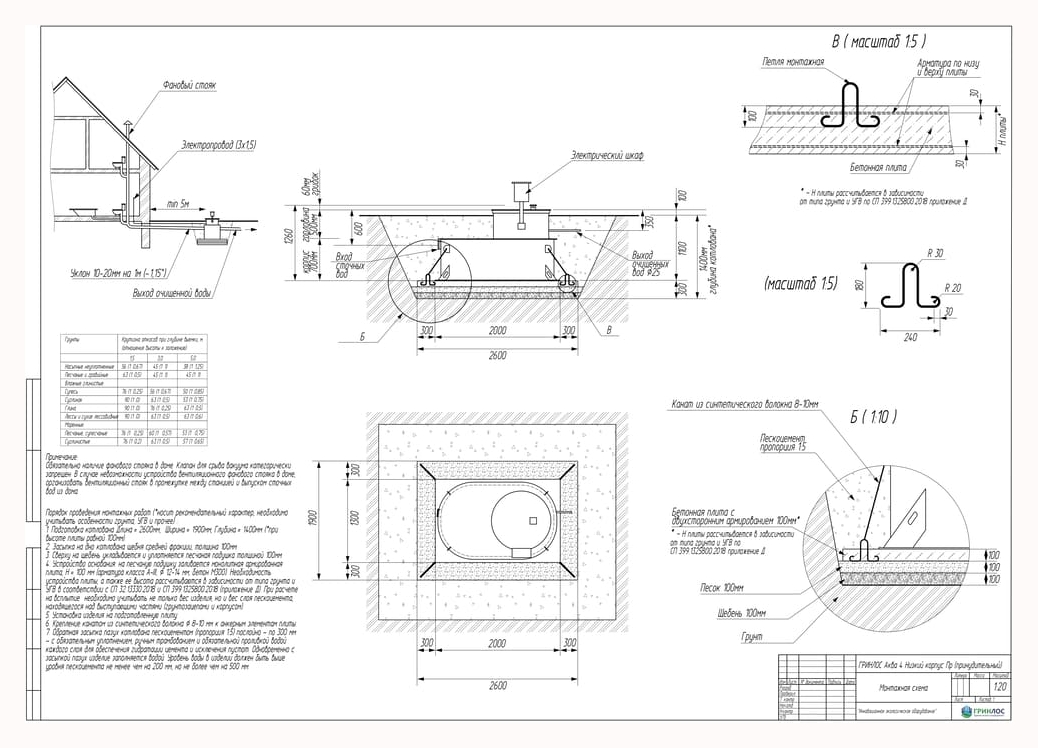 Целесообразно доверить выбор и монтаж оборудования специализированной компании. Перед непосредственным монтажом Оборудования специалисты осуществляют подготовку котлована. Его размеры определяются конструктивными особенностями выбранной модели оборудования. Ознакомиться с данными параметрами можно в приложении к ПС. По боковым стенкам корпуса должно быть сохранено свободное расстояние до грунта не менее 250 мм. Дно котлована нуждается в более тщательной подготовке. Его подвергают выравниванию с последующей засыпкой слоем песка, обладающим толщиной в пределах 10-15 см. Пазухи котлована подвергают обратной засыпке при помощи песка, который послойно поливают водой. Прежде чем приступить к аналогичным работам, емкость оборудования на четверть заполняют водой. Впоследствии количество воды внутри емкости увеличивают соразмерно уровню засыпки песком наружных стенок. Каждые 200 мм песка подвергаются ручному уплотнению.