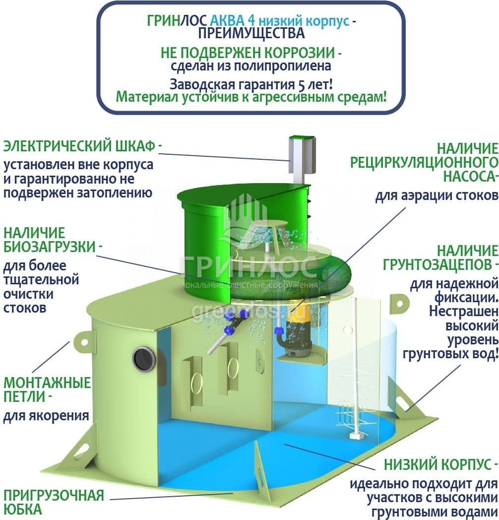 Отличительными особенностями септика ГРИНЛОС Аква 4 низкий корпус являются: