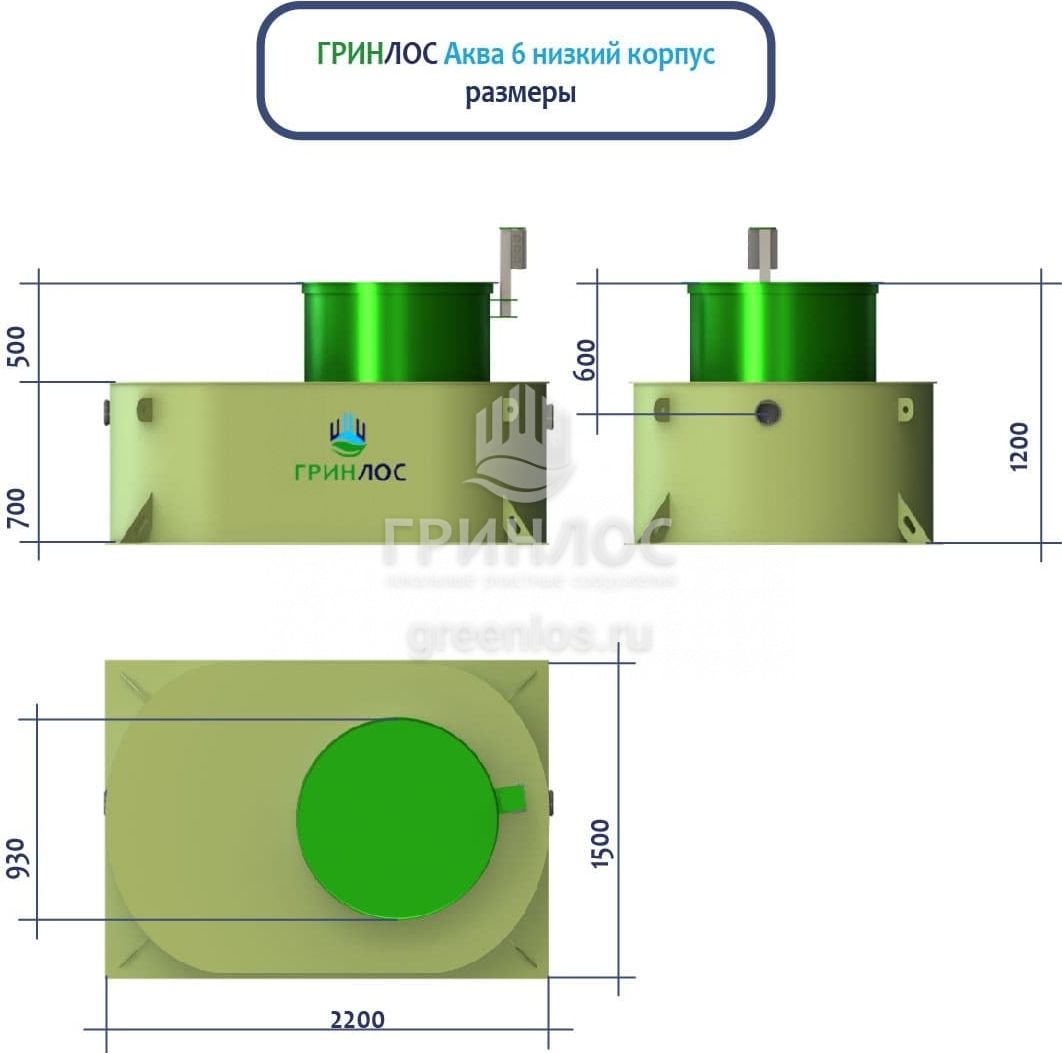 ГРИНЛОС Аква 6 низкий корпус — это самотечная модель септика с уменьшенной высотой корпуса. Обладает объемом залпового сброса 540 л и производительностью 1.2 м3/сутки, что делает его подходящим для домов, в которых число жильцов не превышает 6 условных пользователей.