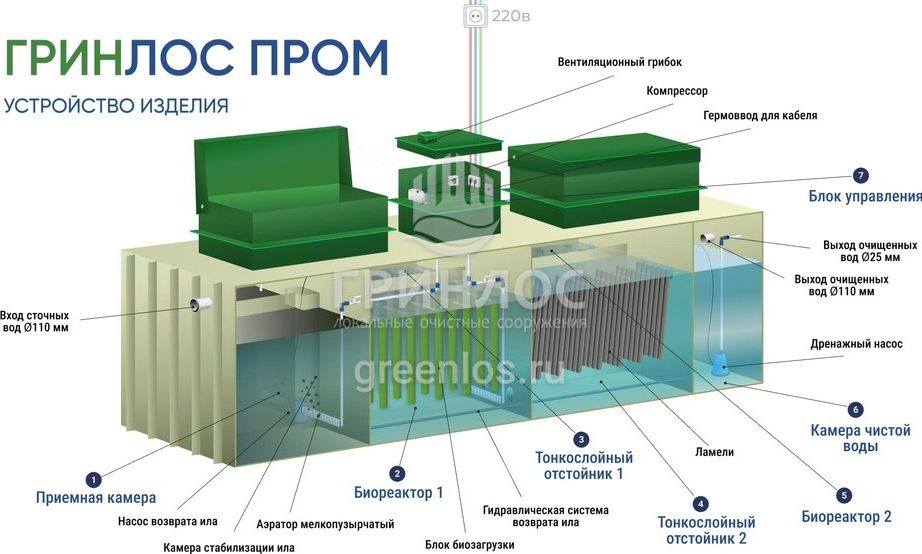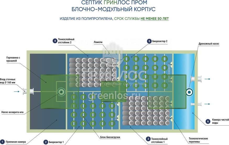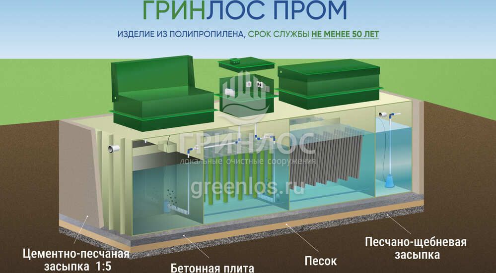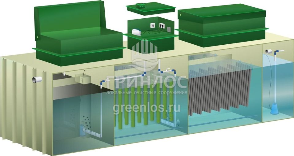 Конструкция камер-переливов в ГРИНЛОС БМ 50 Пр устроена таким образом, чтобы тракт очистки шёл самоотёком, на каждой ступени оседали тяжёлые взвешенные частицы.