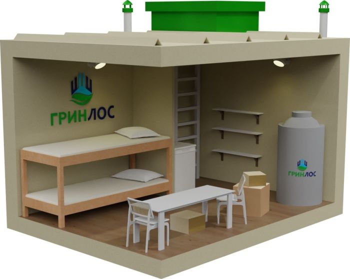ГРИНЛОС Бункер 3500*2300*2000 — это герметично закрываемое помещение полной заводской готовности, перед эксплуатацией заглубляемое под землю. Внешние размеры данной модели составляют 3.5* 2.3* 2400 мм с учетом входа. Бункер оборудован освещением, системой приточной и вытяжной вентиляции, полками и емкостями для хранения, а также бытовым оборудованием.
