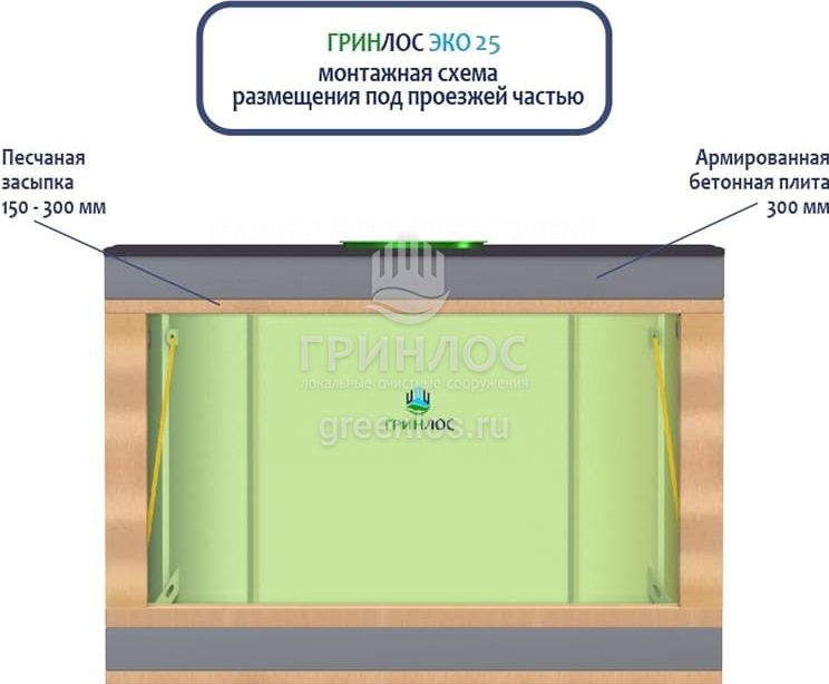 Септик глубокой биохимической переработки хозяйственно-бытовых сточных вод ГРИНЛОС Эко 25 следует располагать так, чтобы к ней мог беспрепятственно подъехать ассенизационный автомобиль. При этом над отстойником и над Септиком ГРИНЛОС Эко в радиусе 2,5 м не допускается движение и стоянка автотранспорта. При необходимости организации стоянки или проезда автотранспорта, необходимо оборудовать разгрузочную плиту над очистным сооружением и над подводящей и отводящей трассами.