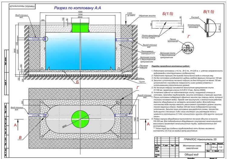 Целесообразно доверить выбор и монтаж оборудования специализированной компании. Перед непосредственным монтажом Оборудования специалисты осуществляют подготовку котлована. Его размеры определяются конструктивными особенностями выбранной модели оборудования. Ознакомиться с данными параметрами можно в приложении к ПС. По боковым стенкам корпуса должно быть сохранено свободное расстояние до грунта не менее 250 мм. Дно котлована нуждается в более тщательной подготовке. Его подвергают выравниванию с последующей засыпкой слоем песка, обладающим толщиной в пределах 10-15 см. Пазухи котлована подвергают обратной засыпке при помощи песка, который послойно поливают водой. Прежде чем приступить к аналогичным работам, емкость оборудования на четверть заполняют водой. Впоследствии количество воды внутри емкости увеличивают соразмерно уровню засыпки песком наружных стенок. Каждые 200 мм песка подвергаются ручному уплотнению.