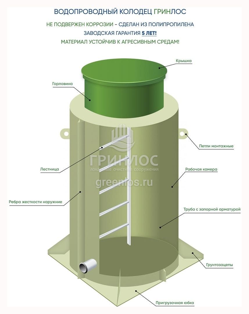 ГРИНЛОС Колодец Водопроводный возможно применять при устройстве бытовой и промышленной системы водоснабжения, для работы как с технической, так и с питьевой водой. Применяется как в частных домах, так и при монтаже коллекторов и водопроводных магистралей.