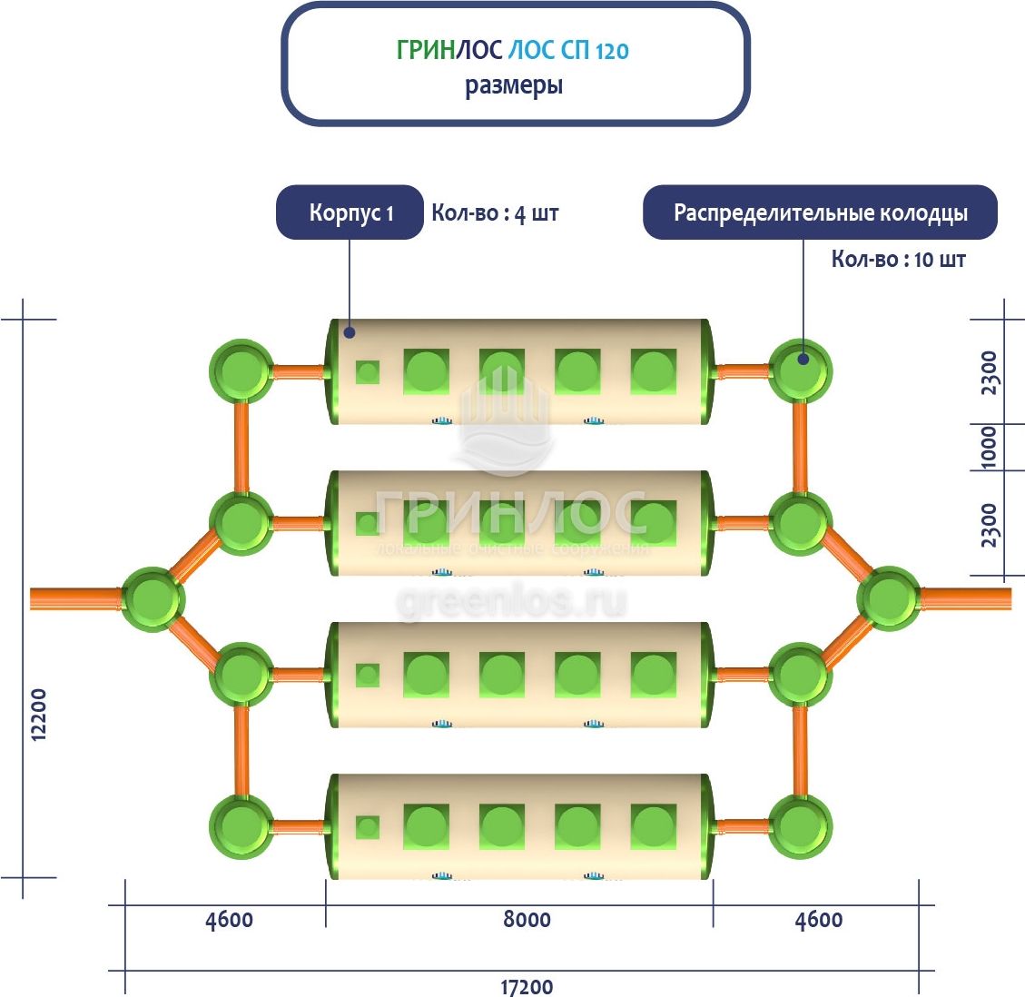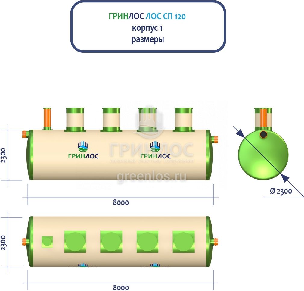 ГРИНЛОС Ливневая канализация 120-2300 стеклопластиковая представляет собой очистное сооружение ливневых стоков габаритами 8000*2300*2300 мм - 4 корпуса. Общий объем корпусов составляет 132.9 м3. Для установки станции потребуется применение вспомогательного оборудования.