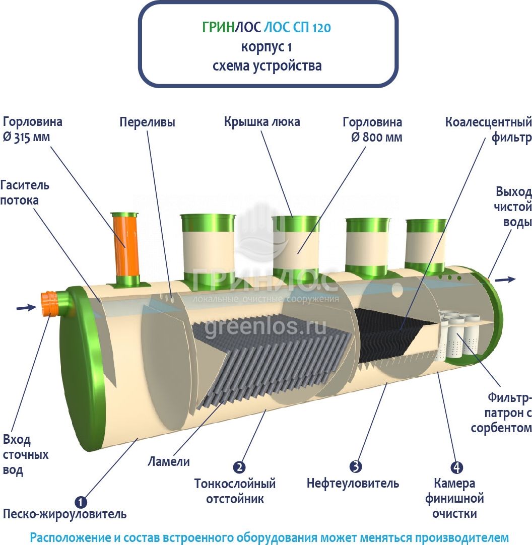 В базовую комплектацию Ливневой канализации Гринлос входит нефтеловушка, которая работает по принципу отстаивания стоков