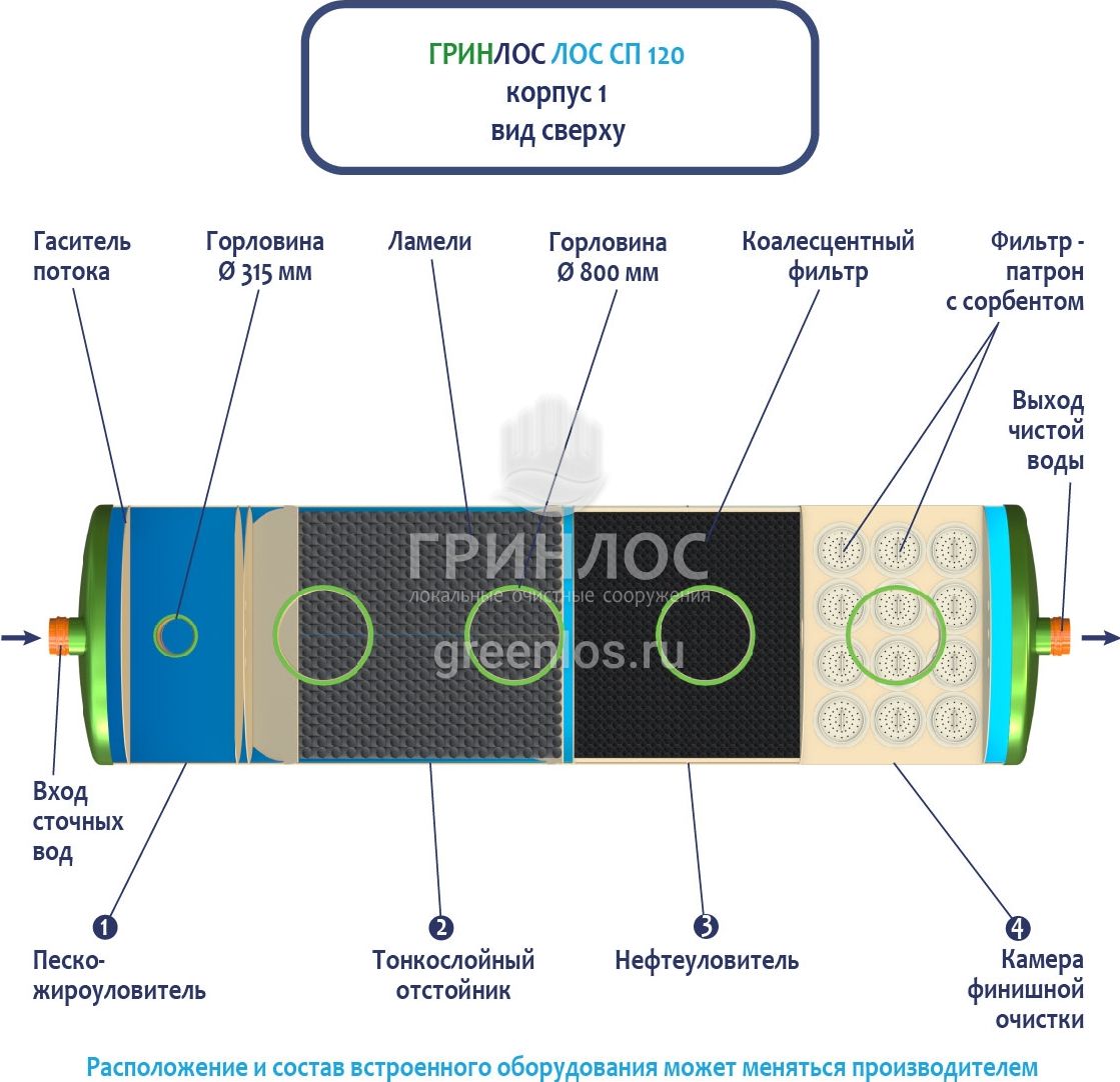 Стоки через входной патрубок корпуса Гринлос ГРИНЛОС Ливневая канализация 120-2300 стеклопластиковая попадают в песко-жироуловитель, где под воздействием седиментации из стоков выделяются взвеси и маслянистые вещества, за счет разницы плотностей твердые частицы оседают на дно, жиры собираются на поверхности.
