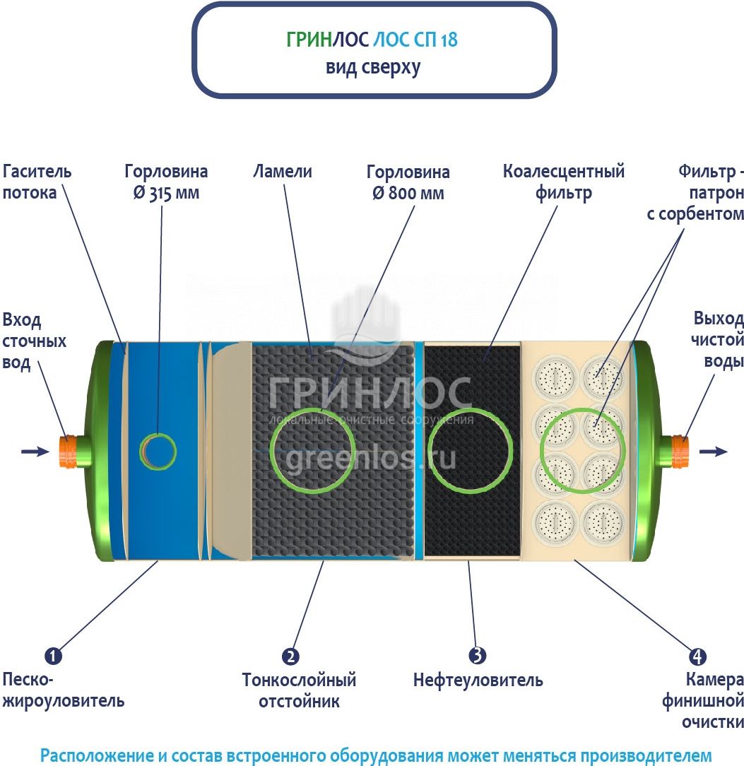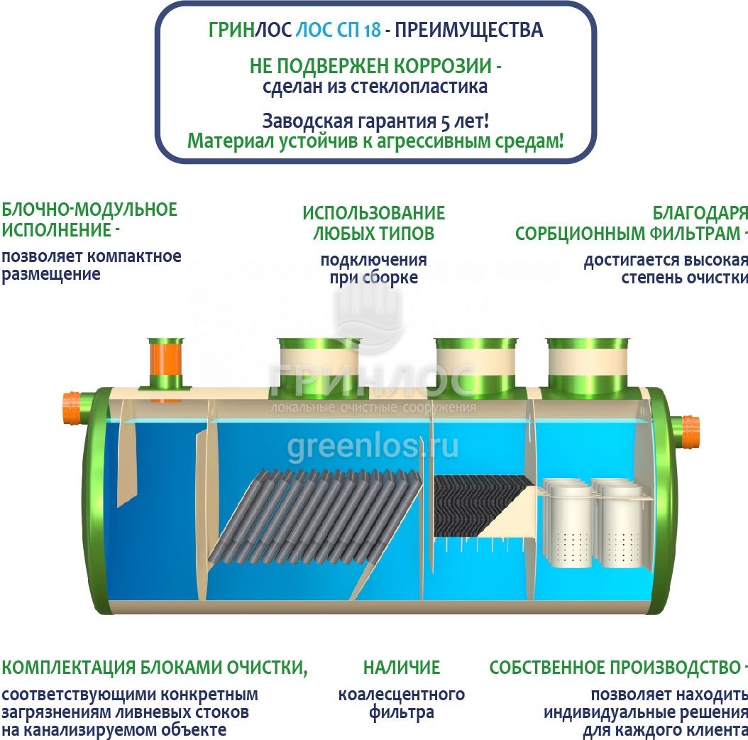 В базовую комплектацию Ливневой канализации Гринлос входит нефтеловушка, которая работает по принципу отстаивания стоков
