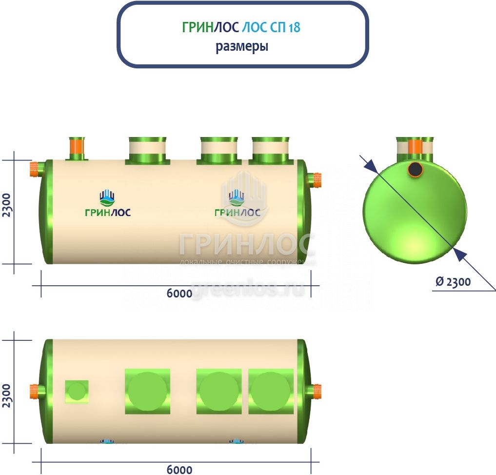 ГРИНЛОС Ливневая канализация 18-2300 стеклопластиковая представляет собой очистное сооружение ливневых стоков габаритами 6000*2300*2300 мм - 1 корпус. Общий объем корпусов составляет 24.9 м3. Для установки станции потребуется применение вспомогательного оборудования.