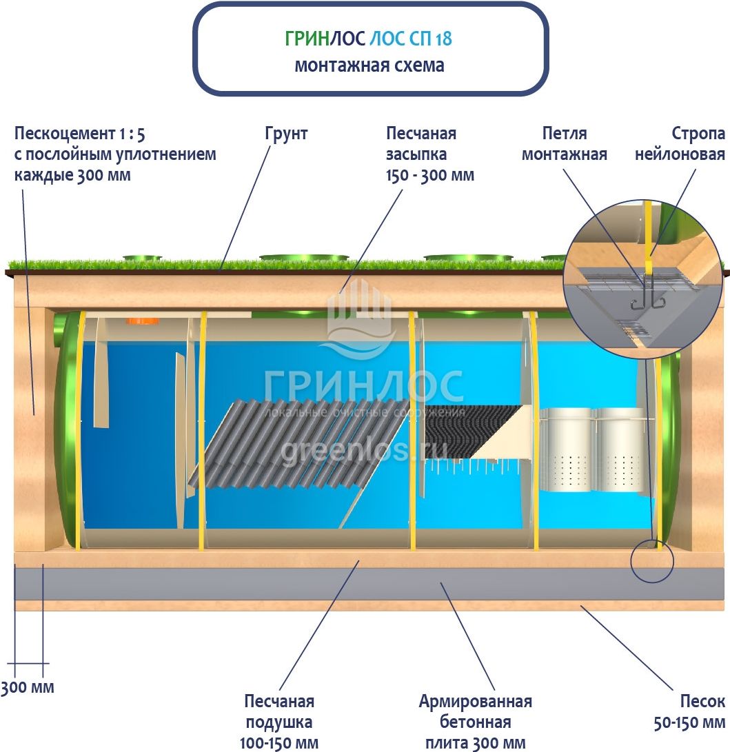 При заглублении ЛОС из стеклопластика на глубину не более 250 мм от верхнего пластикового горизонтального перекрытия до запланированного уровня земли, в однородных грунтах с низким уровнем вод обратную обсыпку допустимо производить песком, смешанным с цементом (марка не ниже М500). Соотношение цемента и песка для обсыпки составляет 1:5. Песчано-цементная засыпка производится послойно, с обязательным трамбованием и проливкой водой каждого слоя. Толщина каждого слоя 300 мм. При условии уровня грунтовых вод выше 1500 мм от уровня земли, при наличии плывуна, скальных грунтов и прочих нестандартных ситуациях, а также в случае заглубления ЛК 18-2300 Сп более чем на 250 мм песчано-цементную смесь необходимо заменить бетоном. Одновременно с засыпкой ливневой канализации, она заполняется водой. Уровень воды должен превышать уровень засыпки (бетонирования) не менее, чем на 200 мм и не более, чем на 500 мм.
