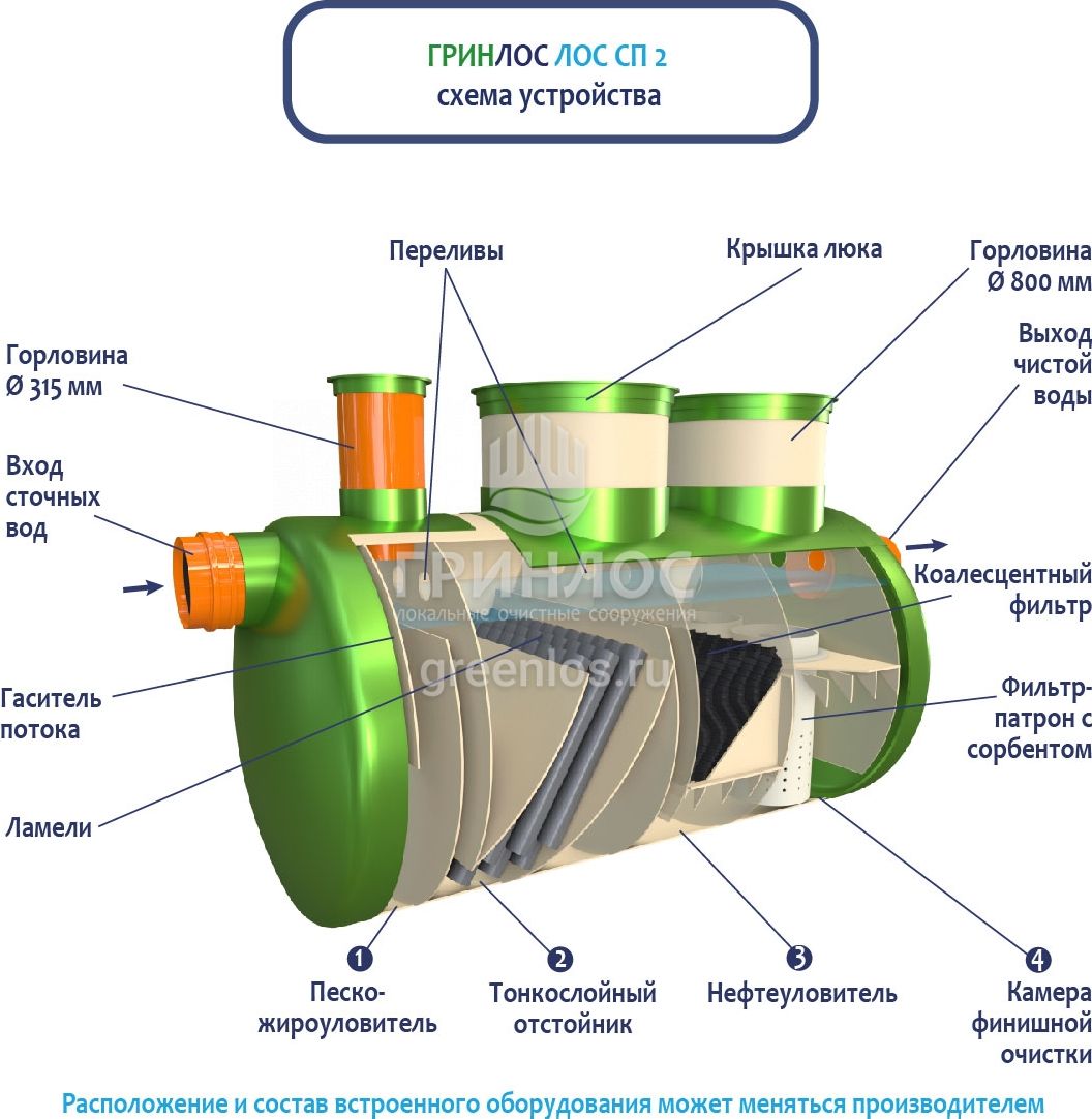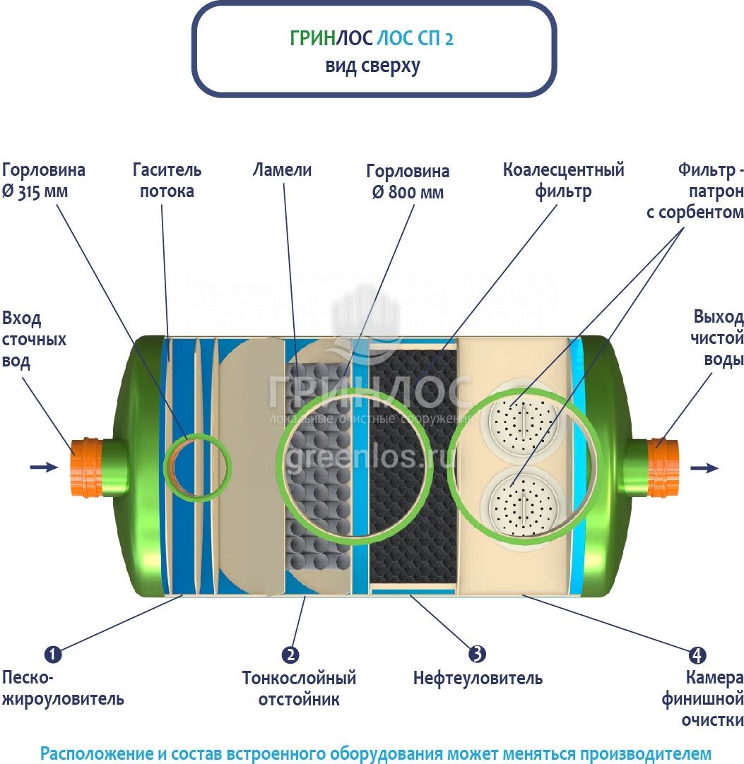В базовую комплектацию Ливневой канализации Гринлос входит нефтеловушка, которая работает по принципу отстаивания стоков