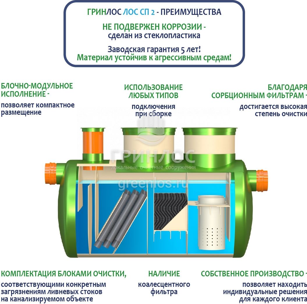 Гринлос ЛК 2-1500 Сп выполнена из стеклопластика – инертного материала, устойчивого к агрессивным средам.