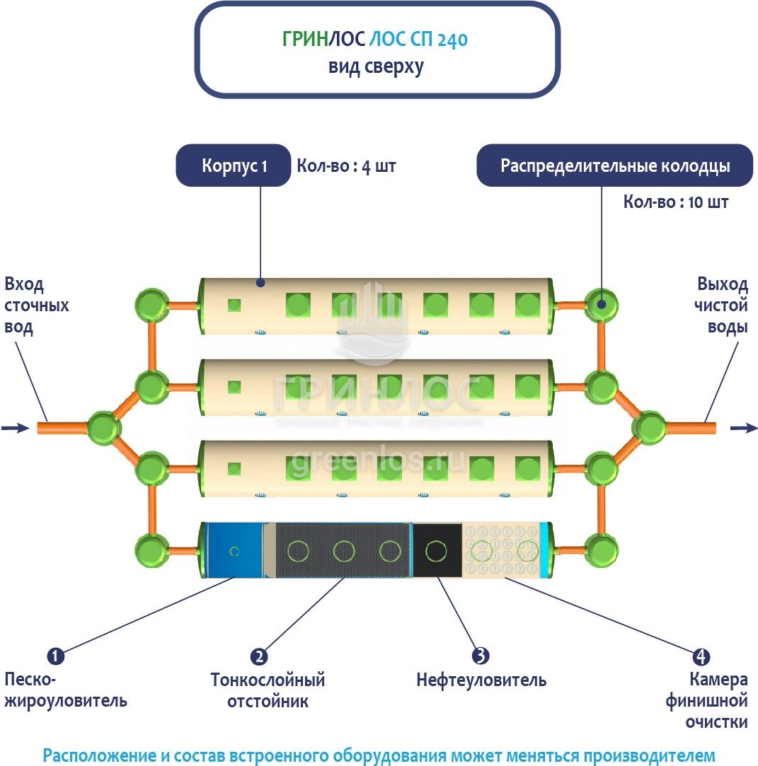 В Ливневой канализации ГРИНЛОС на 240м3 применяется классический принцип очистки дождевых и талых вод, заключающийся в поэтапном прохождении стоков через четыре отсека: