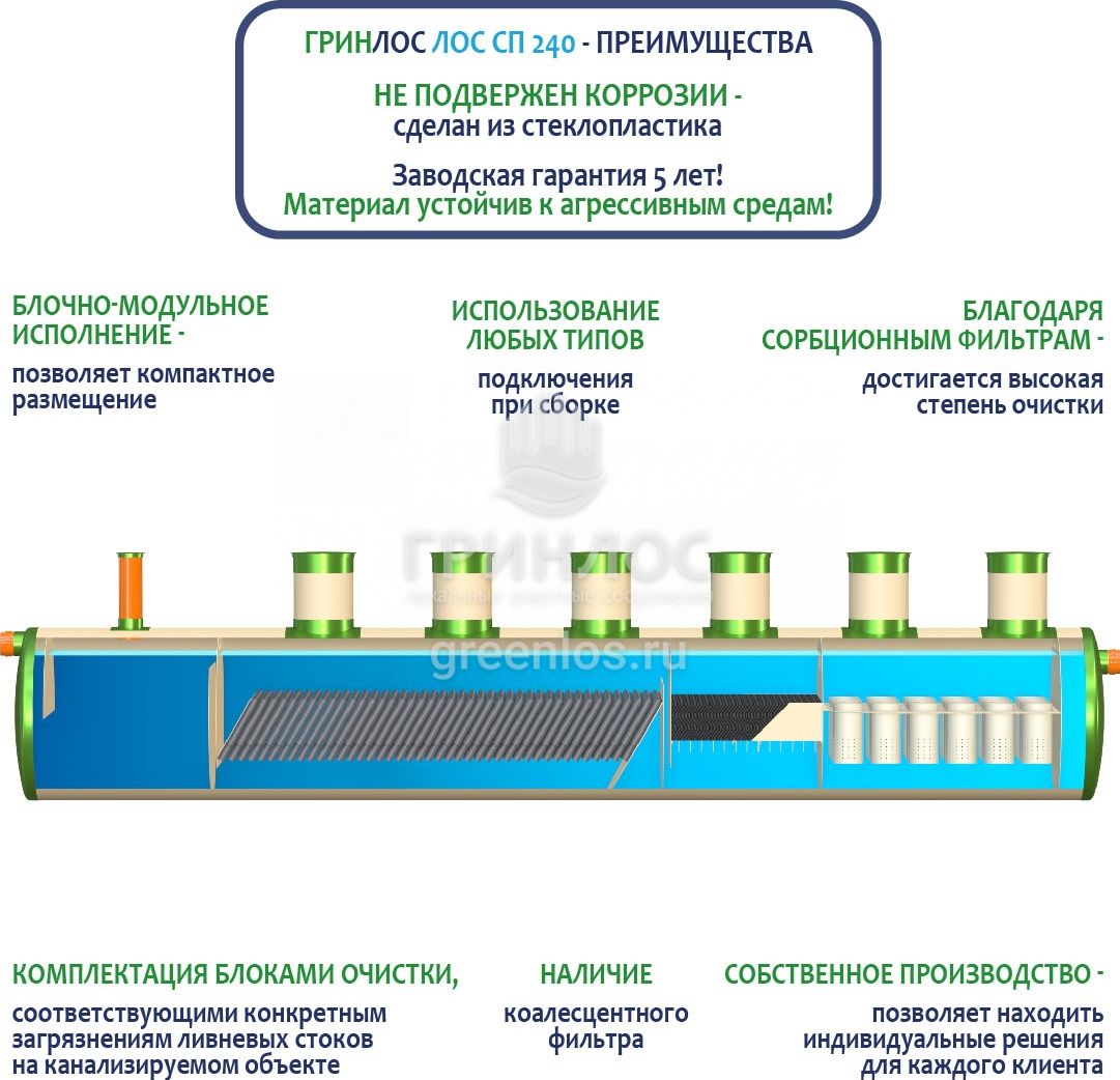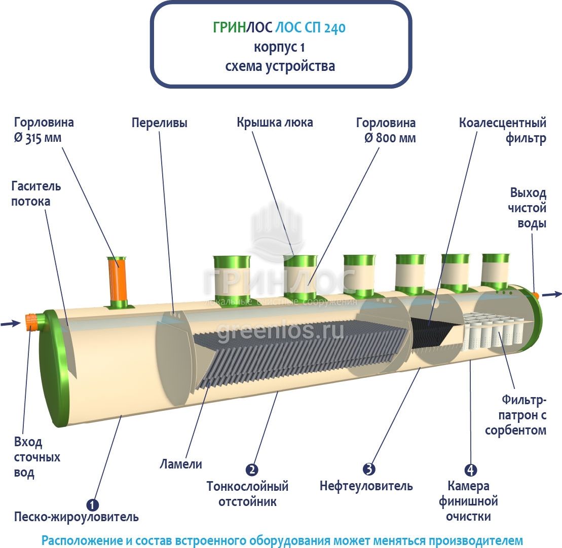 В базовую комплектацию Ливневой канализации Гринлос входит нефтеловушка, которая работает по принципу отстаивания стоков
