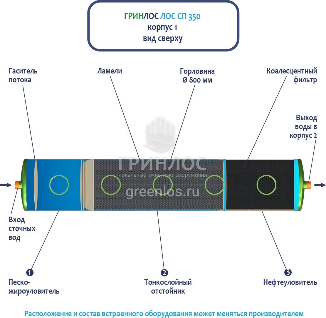 Стоки через входной патрубок корпуса Гринлос ГРИНЛОС Ливневая канализация 350-2300 стеклопластиковая попадают в песко-жироуловитель, где под воздействием седиментации из стоков выделяются взвеси и маслянистые вещества, за счет разницы плотностей твердые частицы оседают на дно, жиры собираются на поверхности.