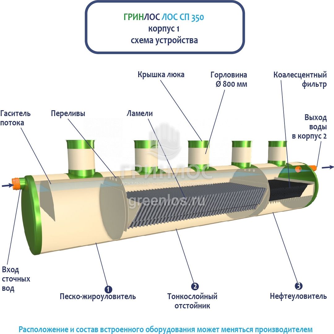 В базовую комплектацию Ливневой канализации Гринлос входит нефтеловушка, которая работает по принципу отстаивания стоков
